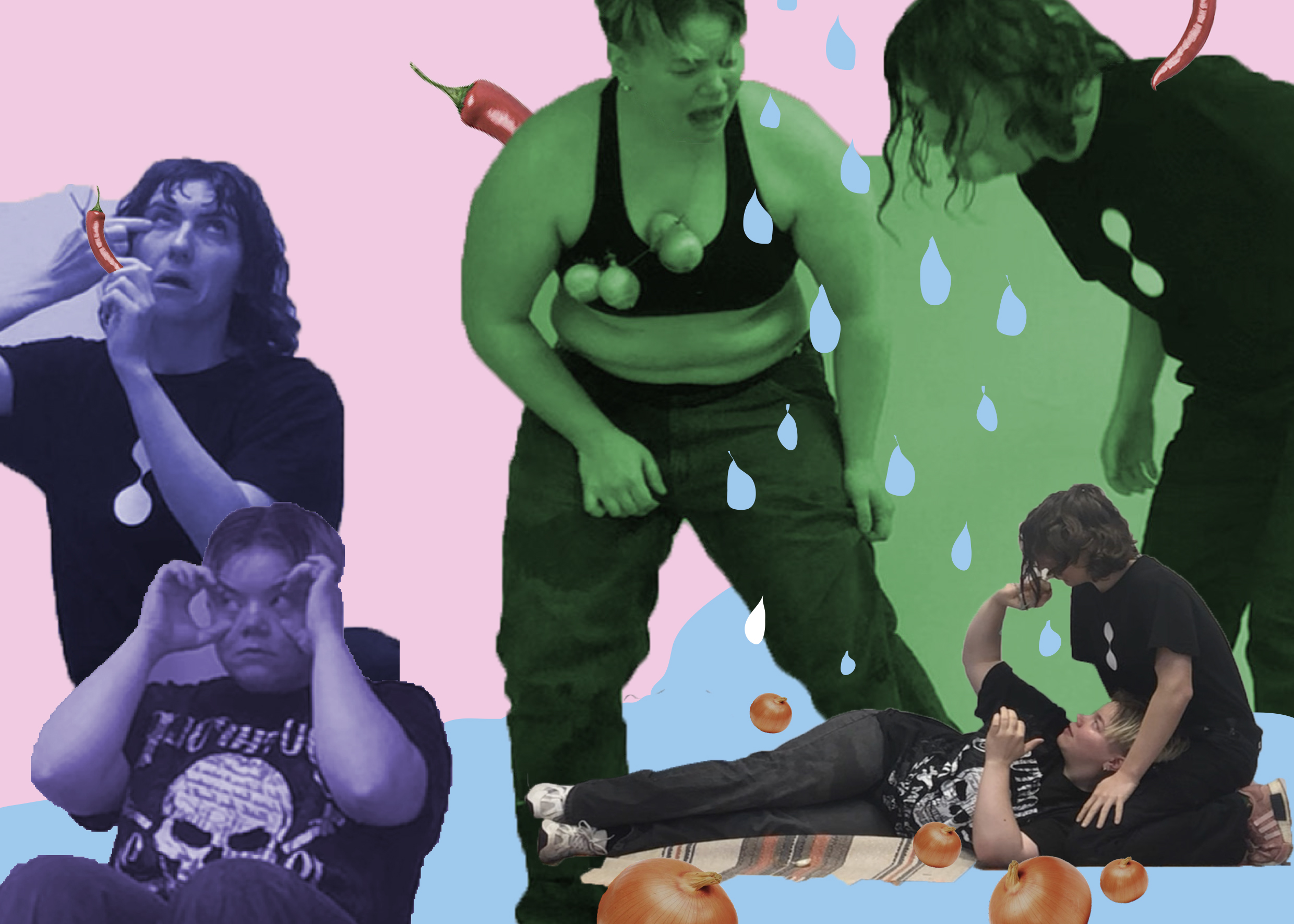 „Metal Tears“ ist eine Performance über die Zerbrechlichkeit und Intensität von Tränen. Drei Performer*innen, eine Schlagzeugerin und zwei Tänzer*innen, versuchen zu weinen, während sich der Raum mit Metal-Musik füllt. Zwiebeln, Chilies, vibrierendes Fleisch und Regenmäntel helfen auf der Suche nach Katharsis – kommst du mit?
